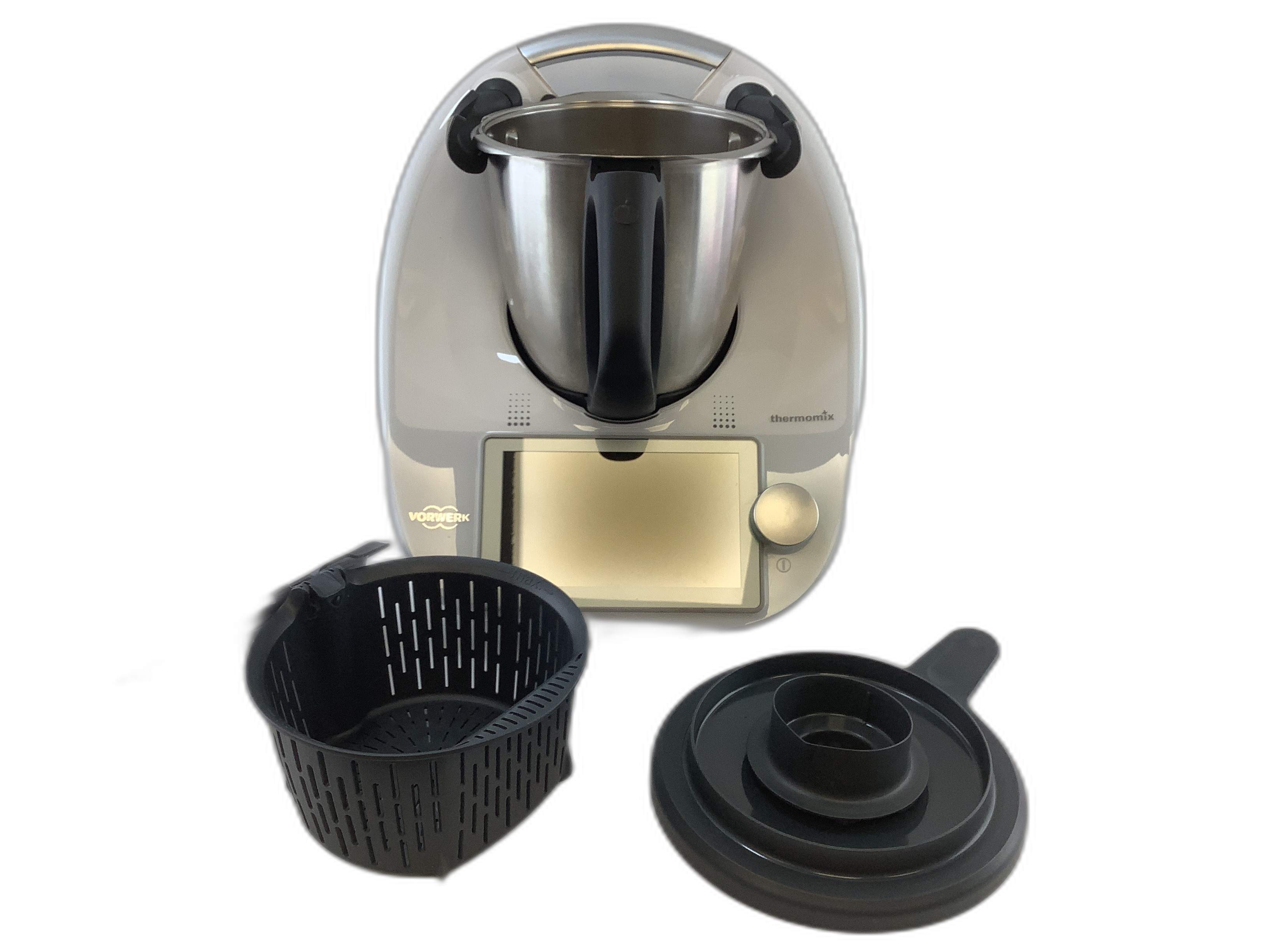 La Thermomix TM6 de segunda mano tiene la posibilidad de complementarse con varios accesorios como el vaso de mezcla, tapa, cestillo, espátula, mariposa, Varoma, y copo dosificador.