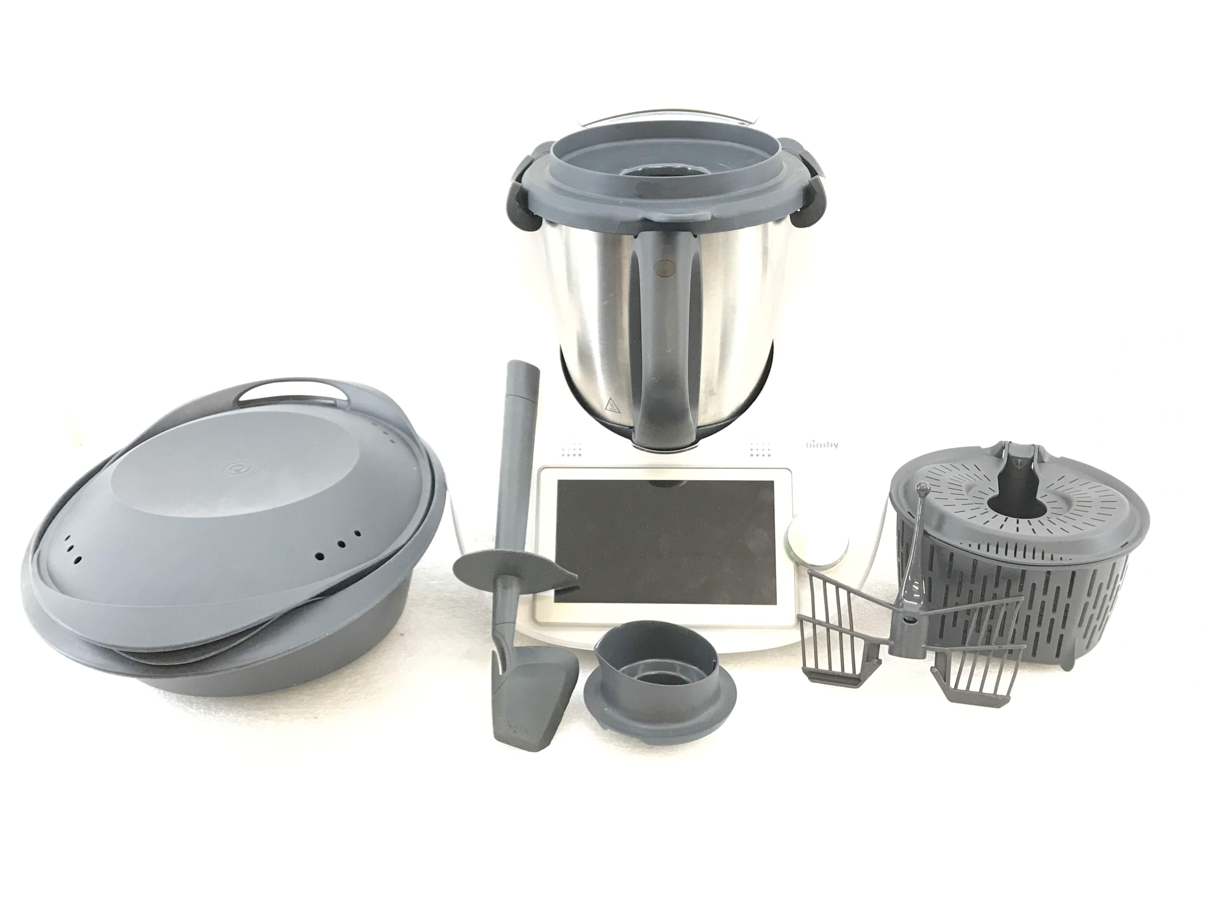 La Thermomix TM6 de segunda mano tiene la posibilidad de complementarse con varios accesorios como el vaso de mezcla, tapa, cestillo, espátula, mariposa, Varoma, y copo dosificador.