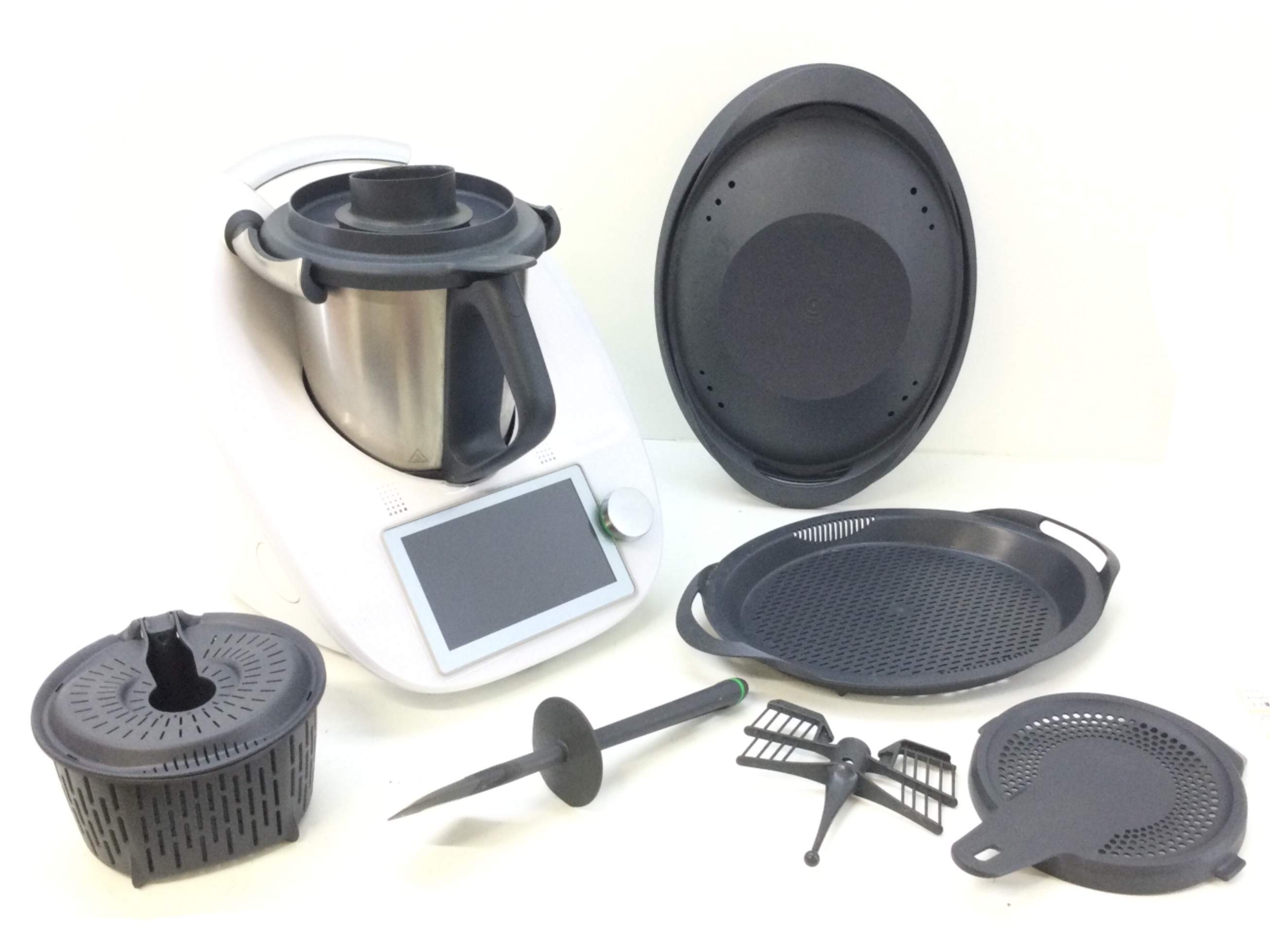 La Thermomix TM6 de segunda mano tiene la posibilidad de complementarse con varios accesorios como el vaso de mezcla, tapa, cestillo, espátula, mariposa, Varoma, y copo dosificador.