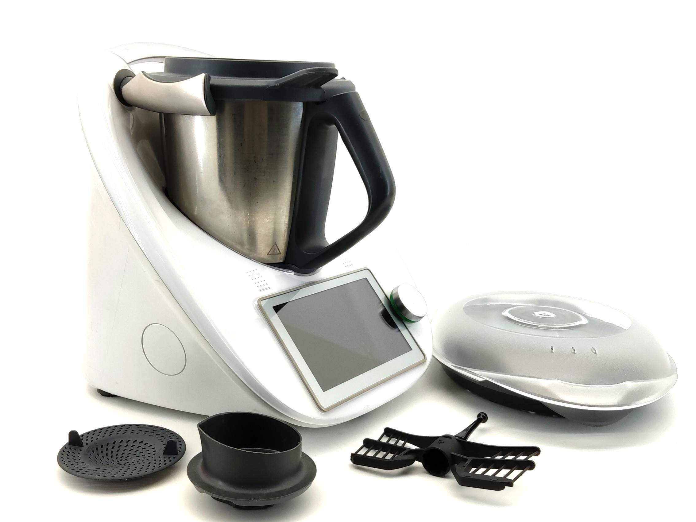 La Thermomix TM6 de segunda mano tiene la posibilidad de complementarse con varios accesorios como el vaso de mezcla, tapa, cestillo, espátula, mariposa, Varoma, y copo dosificador.